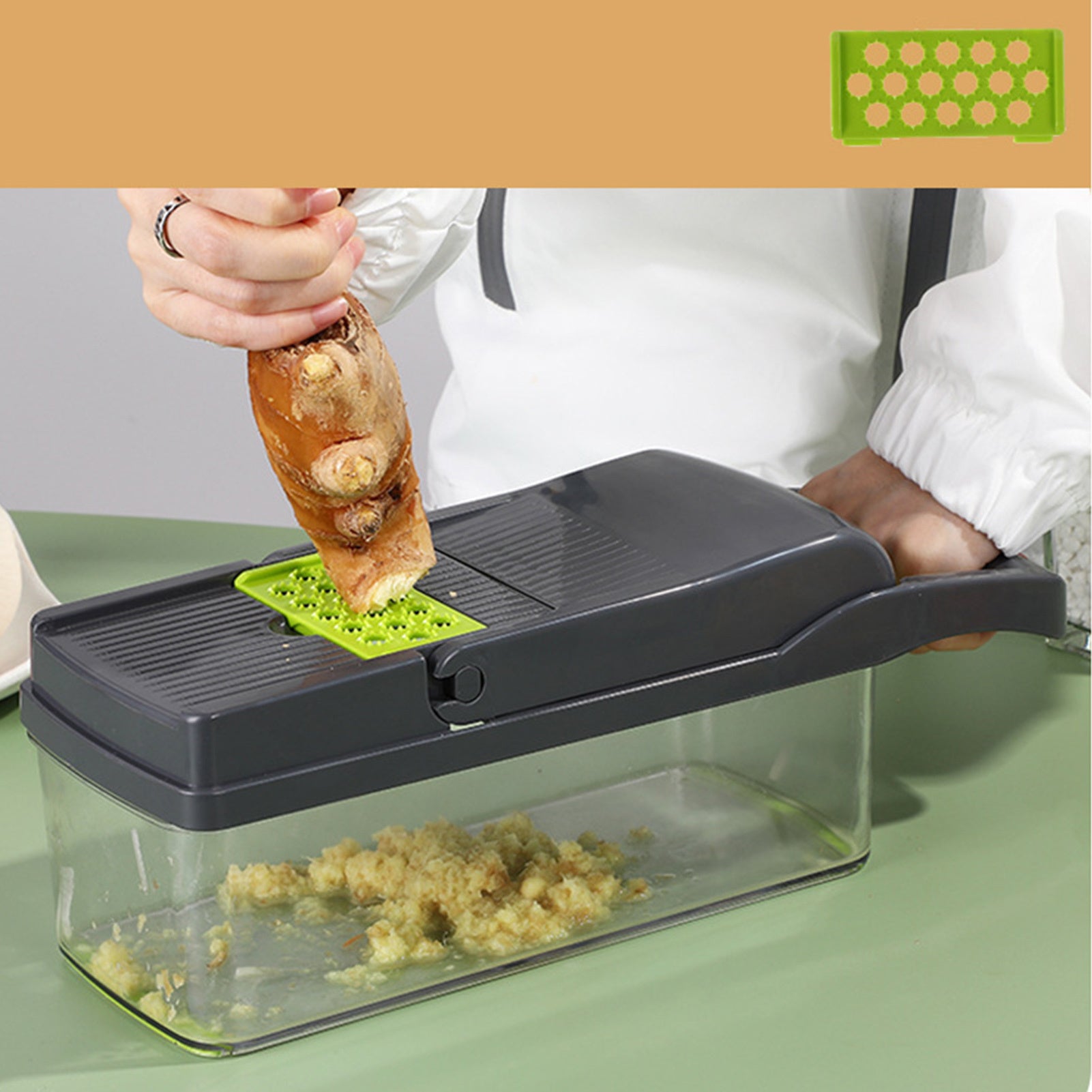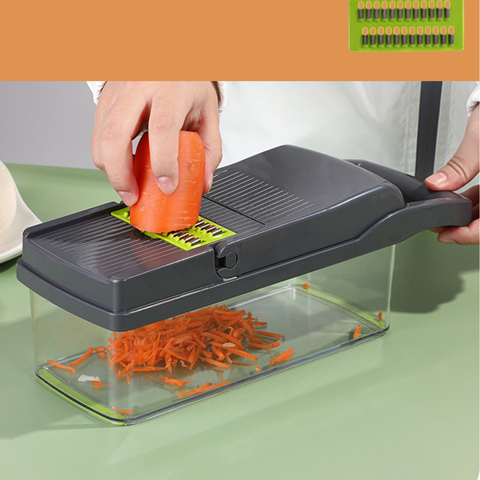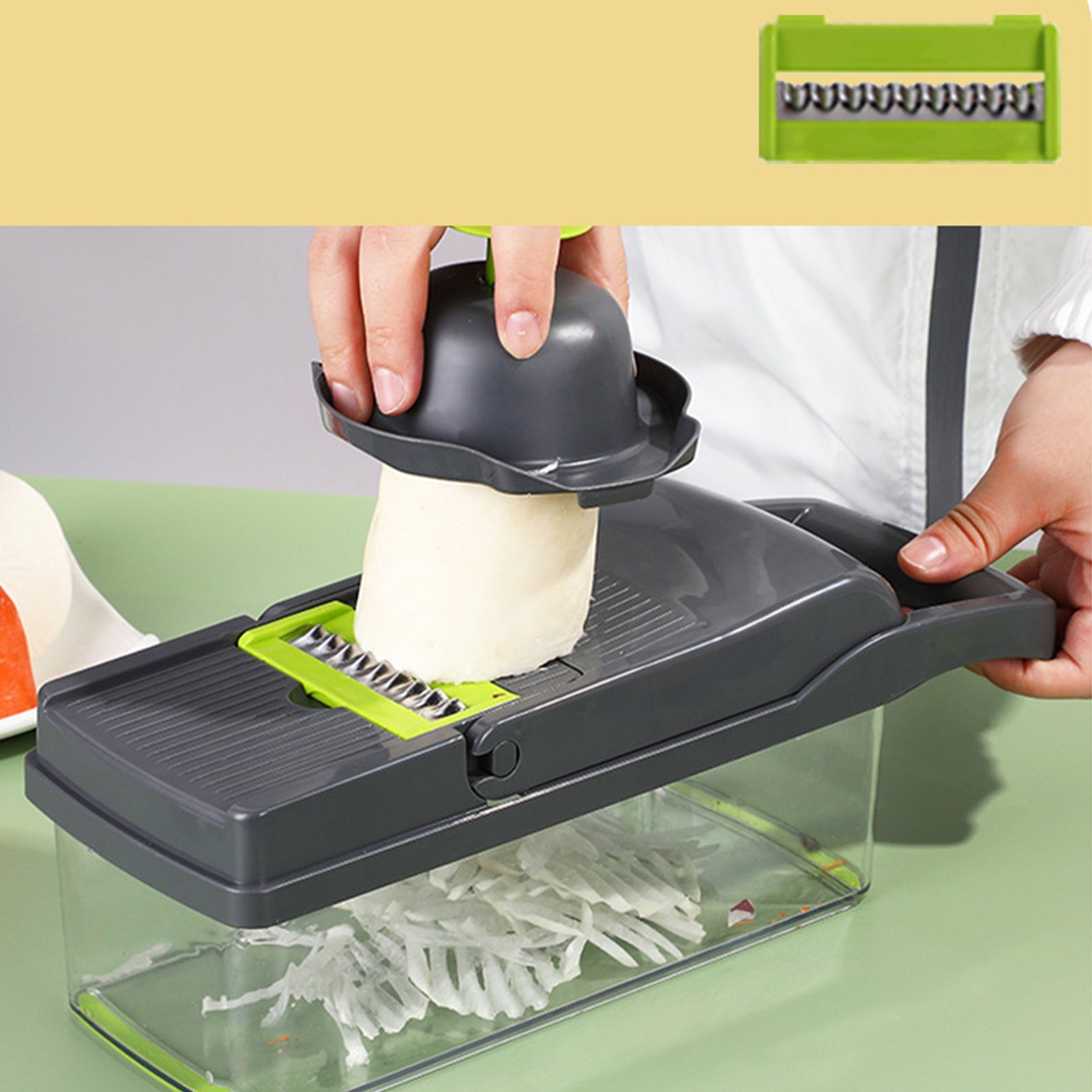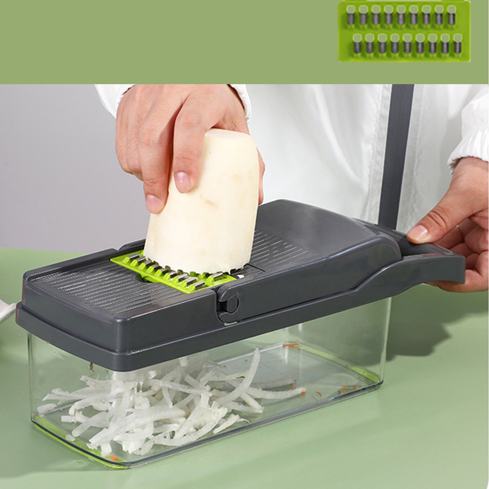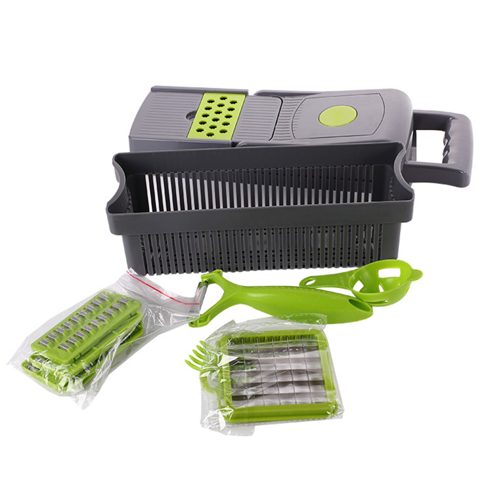 1 x Removable Vegetable Cutter with Non Slip Handle1 x 2mm/0.08in Vegetable Cutter1 x 3mm/0.12in Shredder Cutter1 x 4mm/0.16in Shredder Cutter1 x Cheese Grater1 x Rolled Edge Cutter1 x Egg Separator1 x Container with Lid and Hand Guard1 x Food Draining Basket1 x Paring Knife1 x Brush2 x Onion Chopper